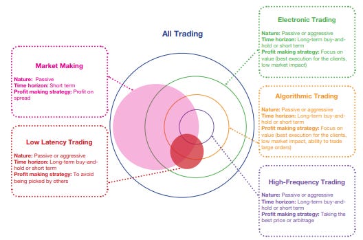 In fact, below, we can see how algorithmic and HFT fit into the wider trading ecosystem, along with low latency trading and market making. Low latency is a prerequisite in many markets for gaining access to good pricing, which is a necessary but not sufficient condition to label a strategy as HFT. Market making is a stand-alone model that uses a high degree of automation to provide two way quotes on securities to traders, with the market maker profiting on spreads.
